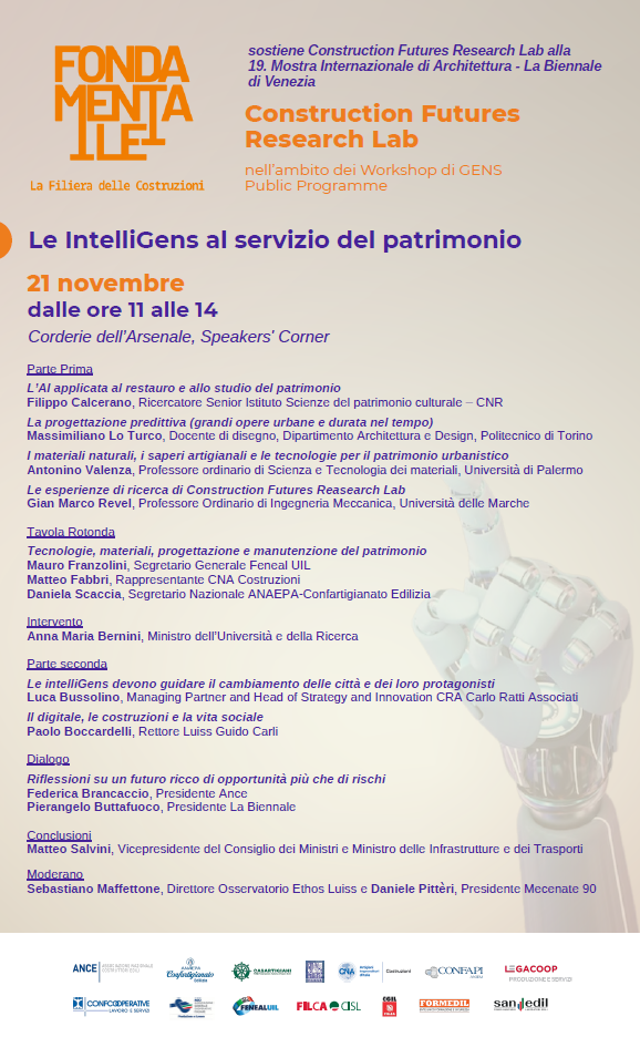 Venerdì 21 novembre alle ore 11.00, lo Speakers’ Corner alle Corderie dell’Arsenale ospiterà Le intelliGens al servizio del patrimonio, quinto e ultimo appuntamento del ciclo di incontri di Construction Futures Research Lab, il progetto di ricerca sostenuto da Fondamentale – la filiera delle costruzioni, che riunisce tre progetti partecipanti alla 19. Mostra Internazionale di Architettura della Biennale di Venezia: Machine Mosaic (Daniela Rus), Co-Poiesis (Philip F. Yuan, Bin He), A Robot’s Dream (Gramazio Kohler Research, ETH Zurich – MESH, Studio Armin Linke).